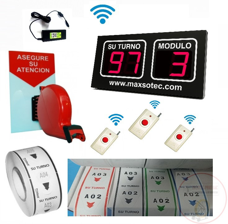 ESPECIFICACIONES TECNICAS: 01 Pantalla Electrónica de 4 dígitos – características: 03 dígitos para “SU TURNO” 01 digito para MODULO (Visor de Led Doble de largo alcance visual) Medidas de la PE04I : 26cm x 49cm 03 Pulsadores inalámbricos 01 Dispensador de Ticket mecánico color rojo 01 Rotulo de acrílico con logo “OBTENGA SU TICKET” 01 Rollo de Ticket con 3000 unidades – FORMATO (000). Cables de Conexión y Accesorios 99 disponibles